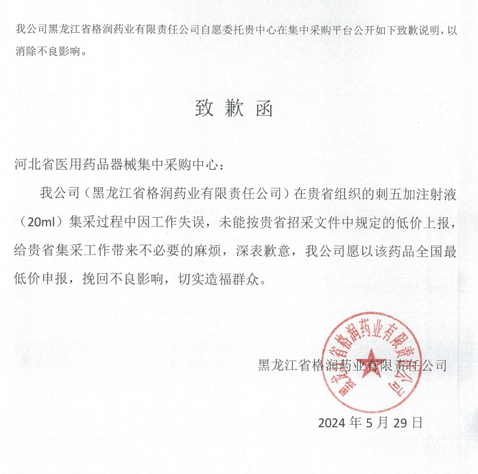 【河北】河北省医用药品器械集中采购中心发布企业致歉函