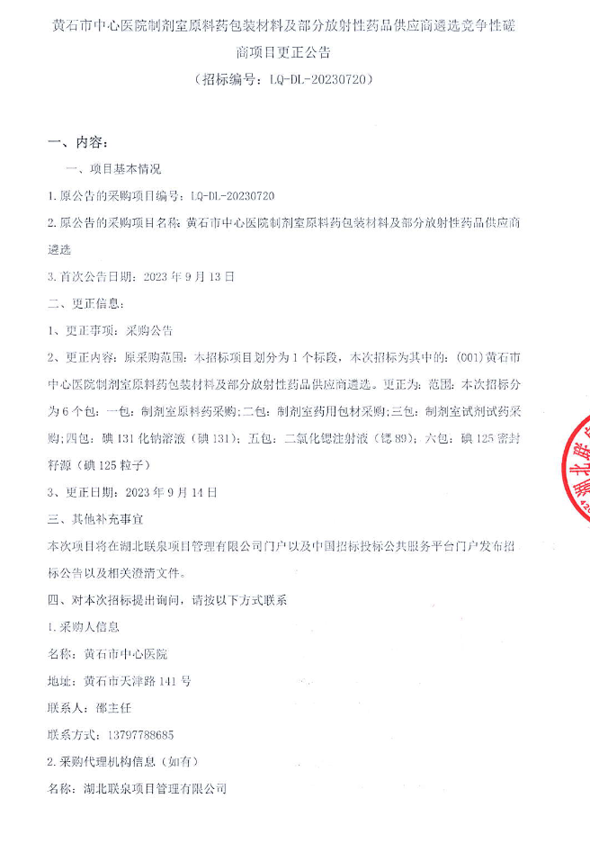 【黄石市中心医院】湖北省黄石市中心医院制剂室原料药包装材料及部分放射性药品供应商遴选竞争性磋商项目更正公告