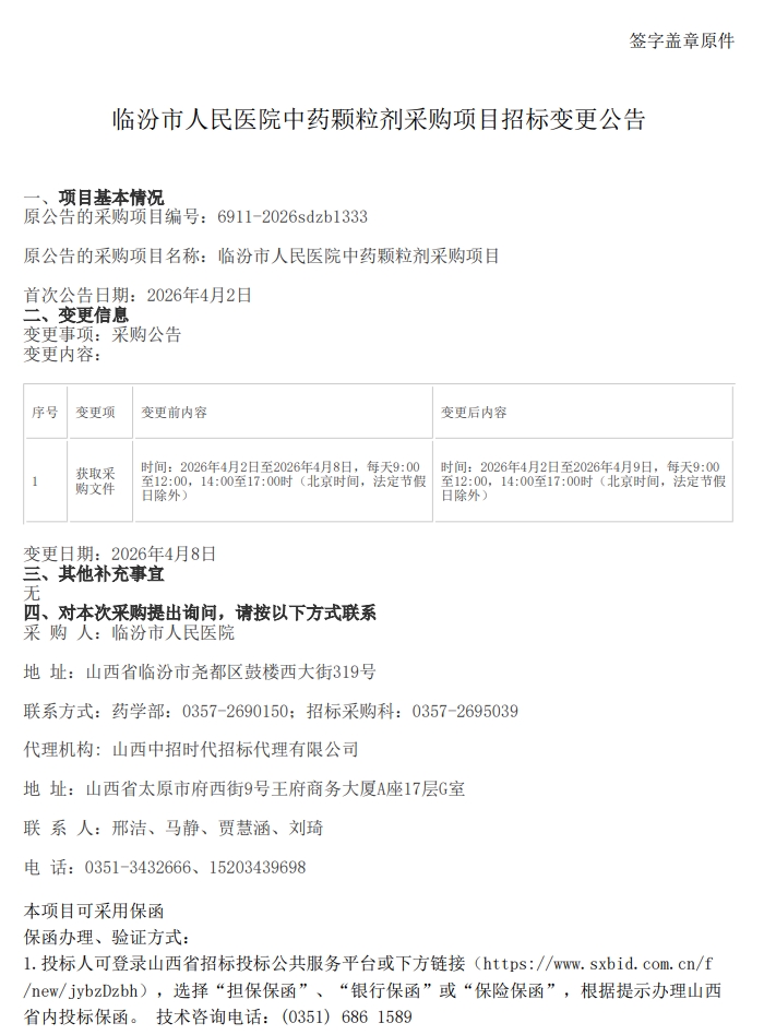 【临汾市人民医院】山西省临汾市人民医院中药颗粒剂采购项目招标变更公告