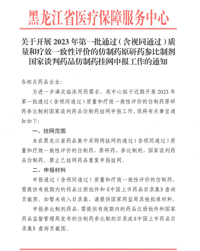 为进一步满足临床用药需求,我中心拟于近期开展2023年第一批通过(含视同通过)质量和疗效一致性评价的仿制药原研药参比制剂国家谈判药品仿制药挂网申报工作,现将有关事宜通知如下: