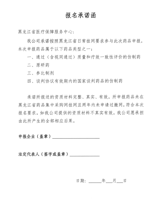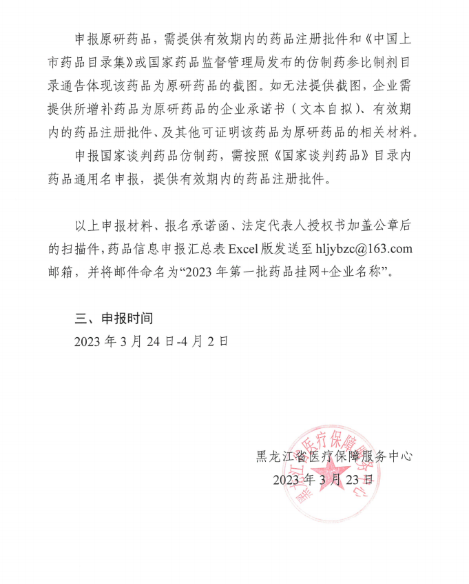 以上申报材料、报名承诺函、法定代表人授权书加盖公章后的扫描件,药品信息申报汇总表Excel版发送至hljybzc@163.com 邮箱,并将邮件命名为"2023年第一批药品挂网+企业名称"。