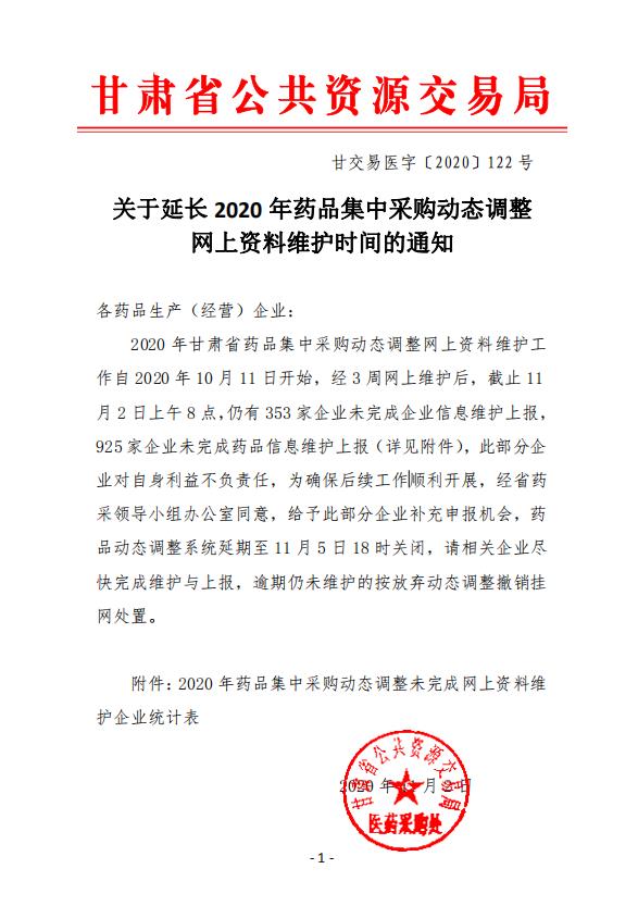 【甘肃】甘肃省关于延长2020年药品集中采购动态调整网上资料维护时间的通知