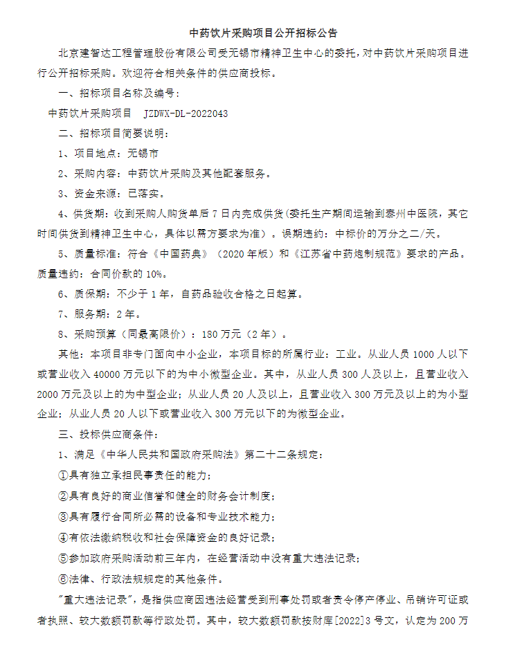 【无锡市精神卫生中心】江苏省无锡市精神卫生中心中药饮片采购项目公开招标公告