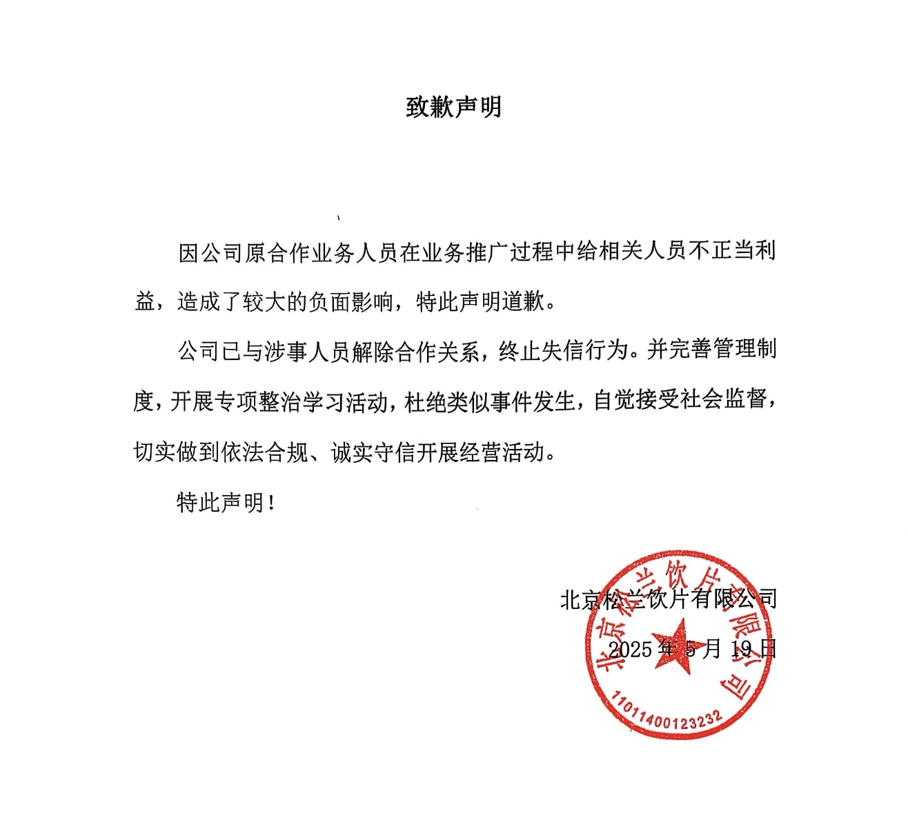【北京】转登"北京松兰饮片有限公司致歉声明的公告"