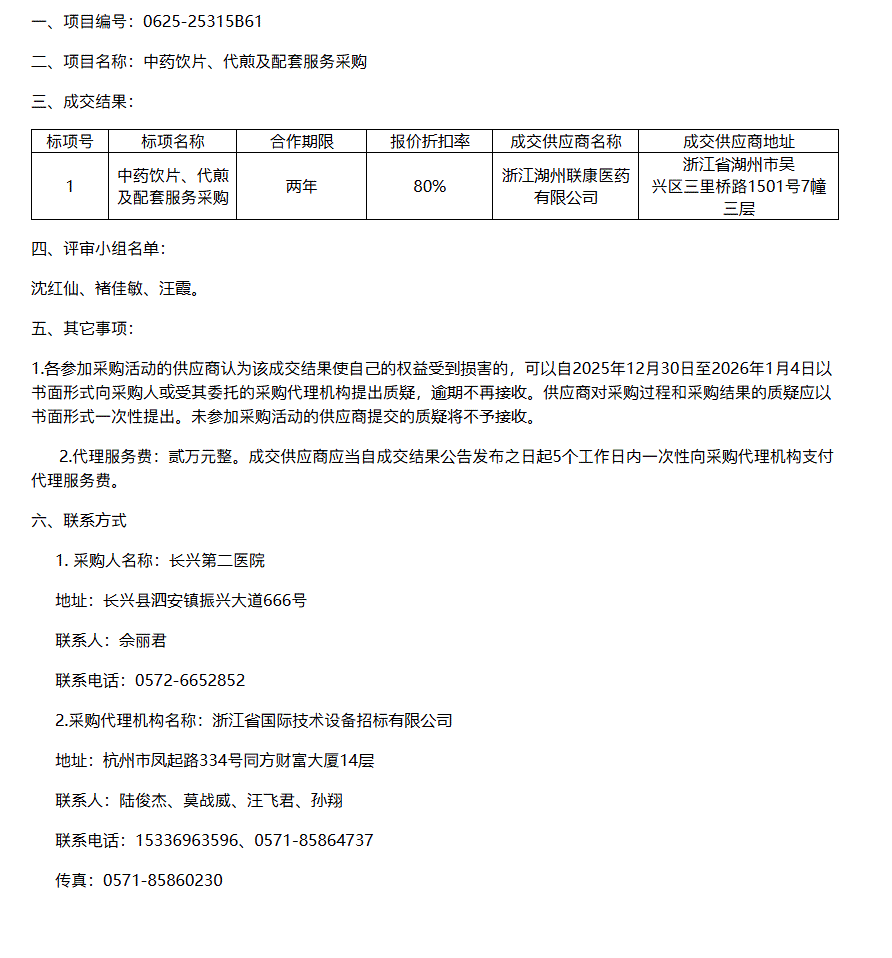 【湖州市长兴第二医院】浙江省国际技术设备招标有限公司关于长兴第二医院中药饮片、代煎及配套服务采购项目的成交结果公告