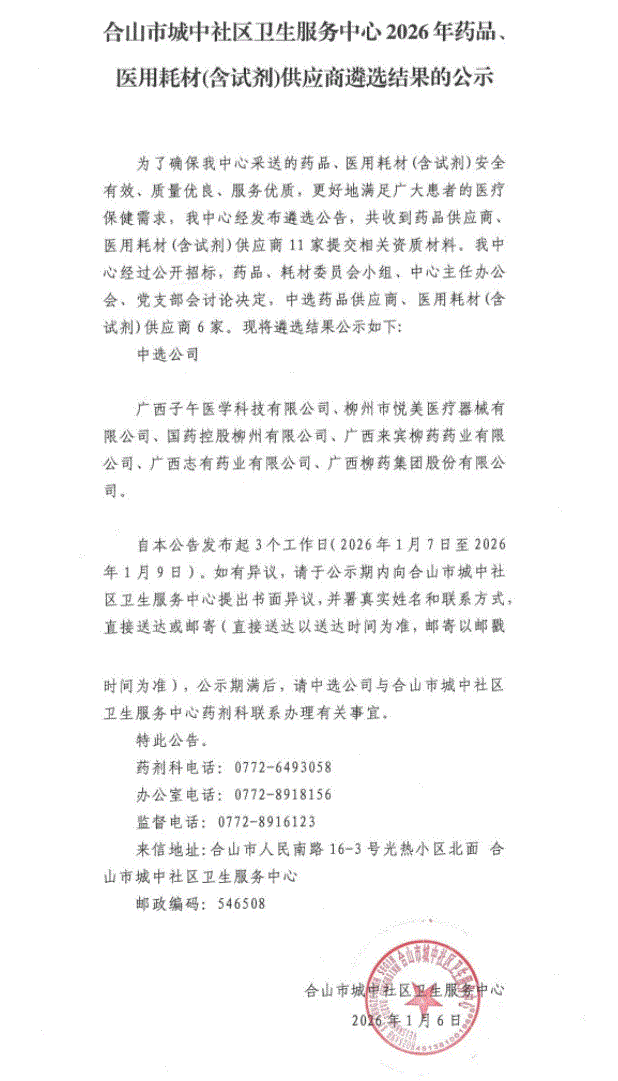 【来宾市合山市城中社区卫生服务中心】广西壮族自治区合山市城中社区卫生服务中心2026年药品、医用耗材(含试剂)供应商遴选结果的公示