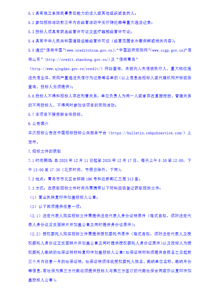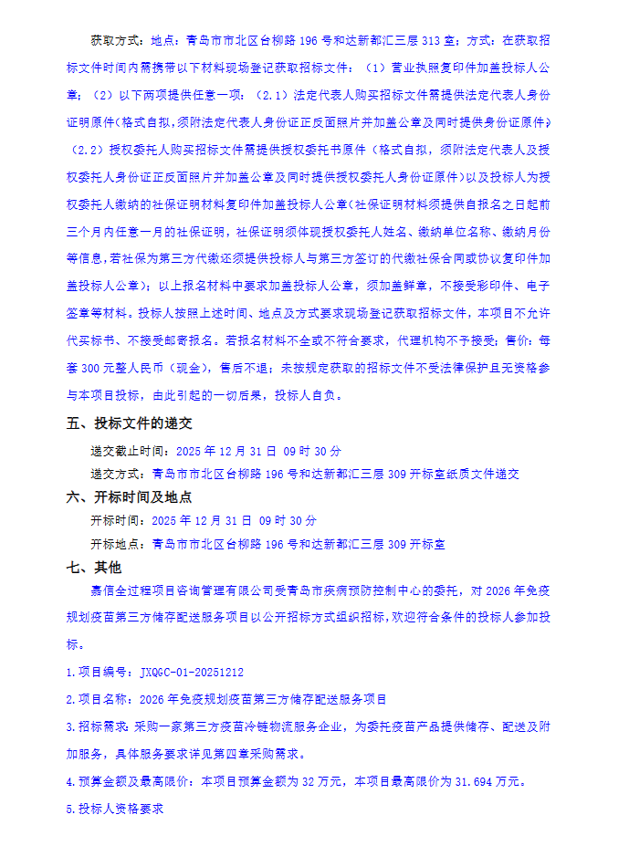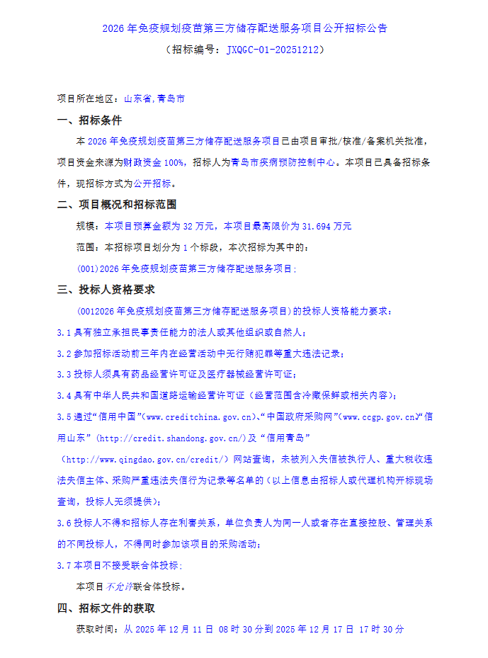 【青岛市疾病预防控制中心】山东省青岛市疾病预防控制中心2026年免疫规划疫苗第三方储存配送服务项目公开招标公告