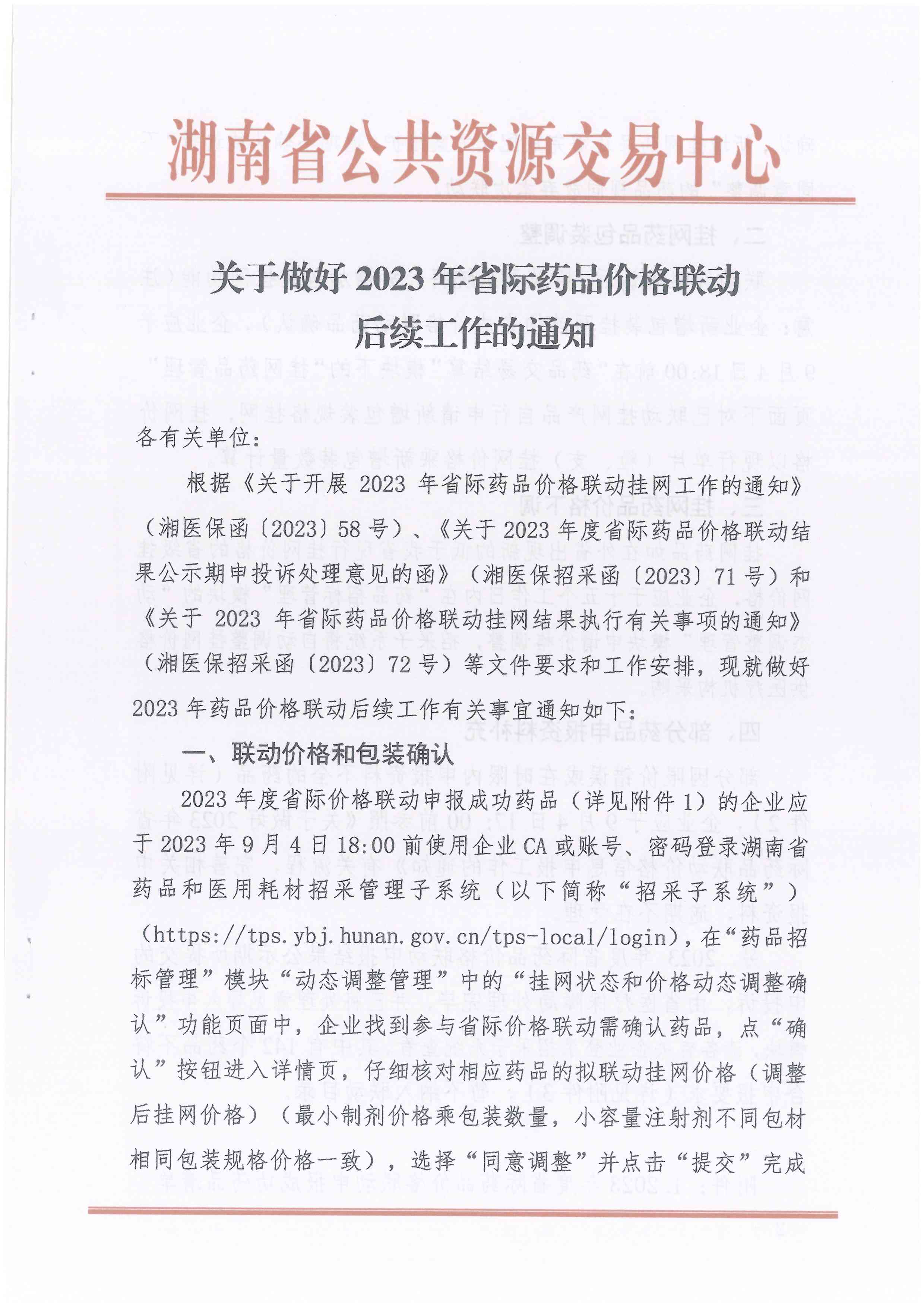 根据《关于开展2023年省际药品价格联动挂网工作的通知》(湘医保函〔2023〕58号)、《关于2023年度省际药品价格联动结果公示期申投诉处理意见的函》(湘医保招采函(2023)71号)和《关于2023年省际药品价格联动挂网结果执行有关事项的通知》(湘医保招采函〔2023)72号〕等文件要求和工作安排,现就做好2023年药品价格联动后续工作有关事宜通知如下: