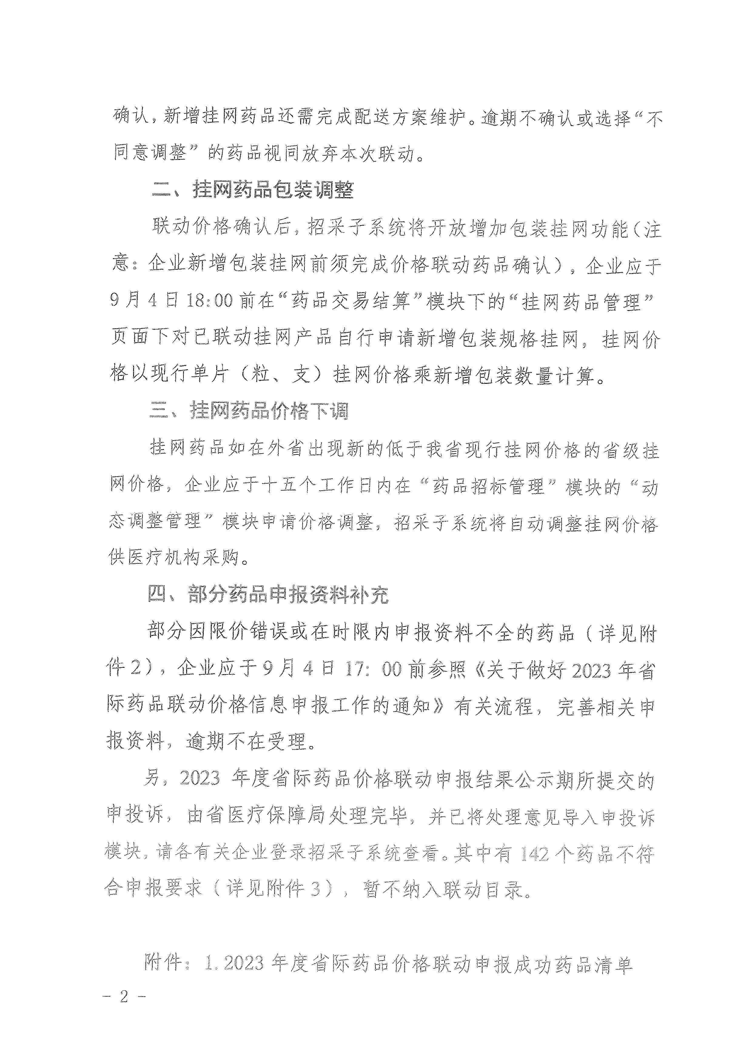 另,2023年度省际药品价格联动申报结果公示期所提交的申投诉,由省医疗保障局处理完毕,并已将处理意见导入申投诉模块。请各有关企业登录招采子系统查看。其中有142个药品不符合甲报要求(详见附件3),暂不纳入联动目录。