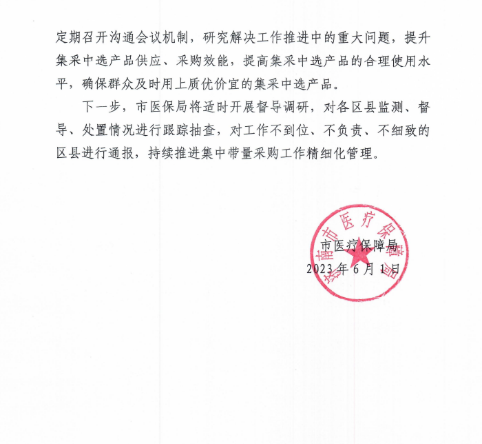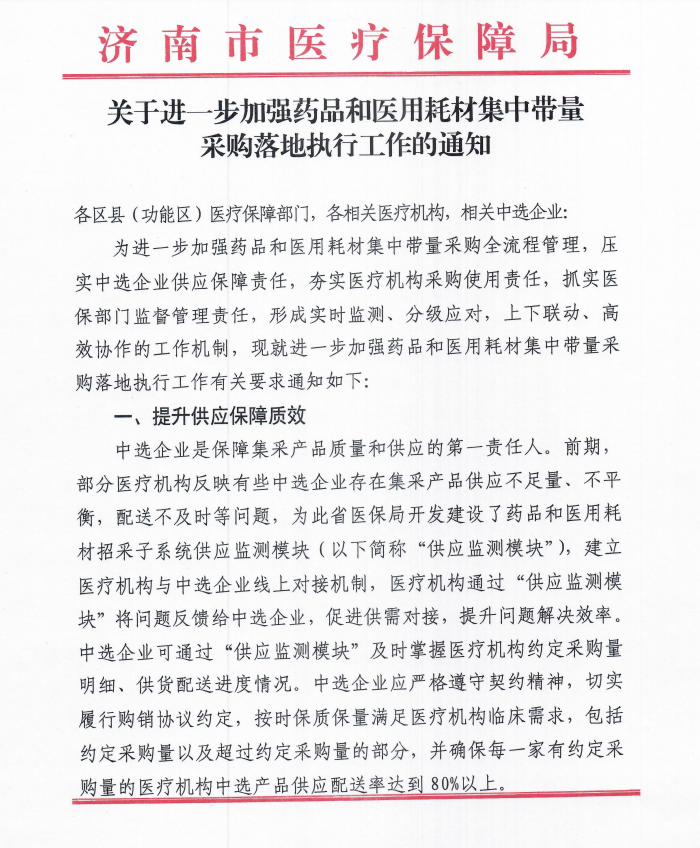 为进一步加强药品和医用耗材集中带量采购全流程管理,压实中选企业供应保障责任,夯实医疗机构采购使用责任,抓实医保部门监督管理责任,形成实时监测、分级应对,上下联动、高效协作的工作机制,现就进一步加强药品和医用耗材集中带量采购落地执行工作有关要求通知如下: