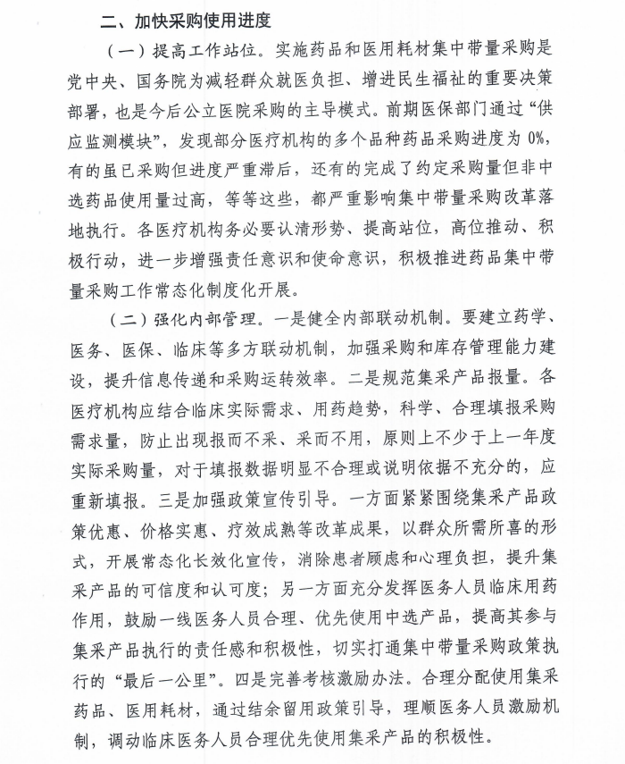 (一)提高工作站位。实施药品和医用耗材集中带量采购是党中央、国务院为减轻群众就医负担、增进民生福祉的重要决策部署,也是今后公立医院采购的主导模式。前期医保部门通过“供应监测模块",发现部分医疗机构的多个品种药品采购进度为0%,有的虽已采购但进度严重滞后,还有的完成了约定采购量但非中选药品使用量过高,等等这些,都严重影响集中带量采购改革落地执行。各医疗机构务必要认清形势、提高站位,高位推动、积极行动,进一步增强责任意识和使命意识,积极推进药品集中带量采购工作常态化制度化开展。