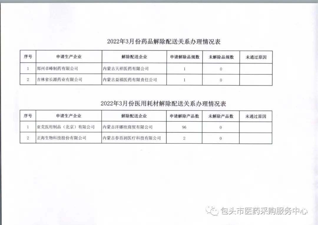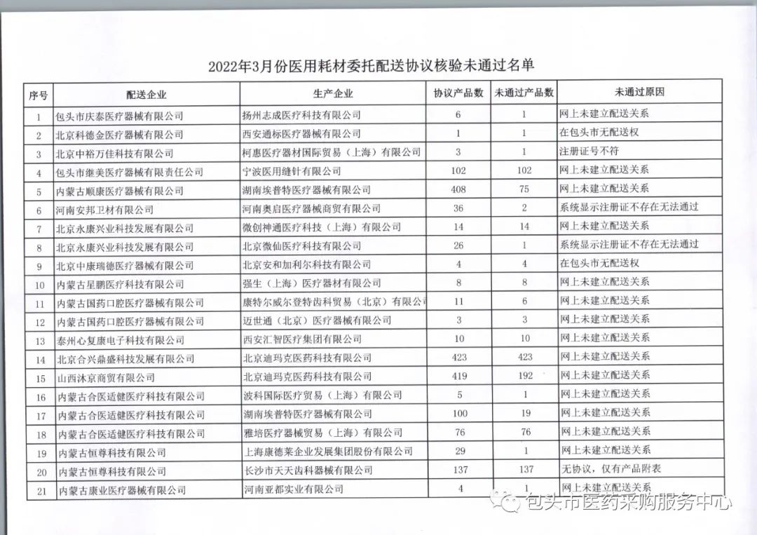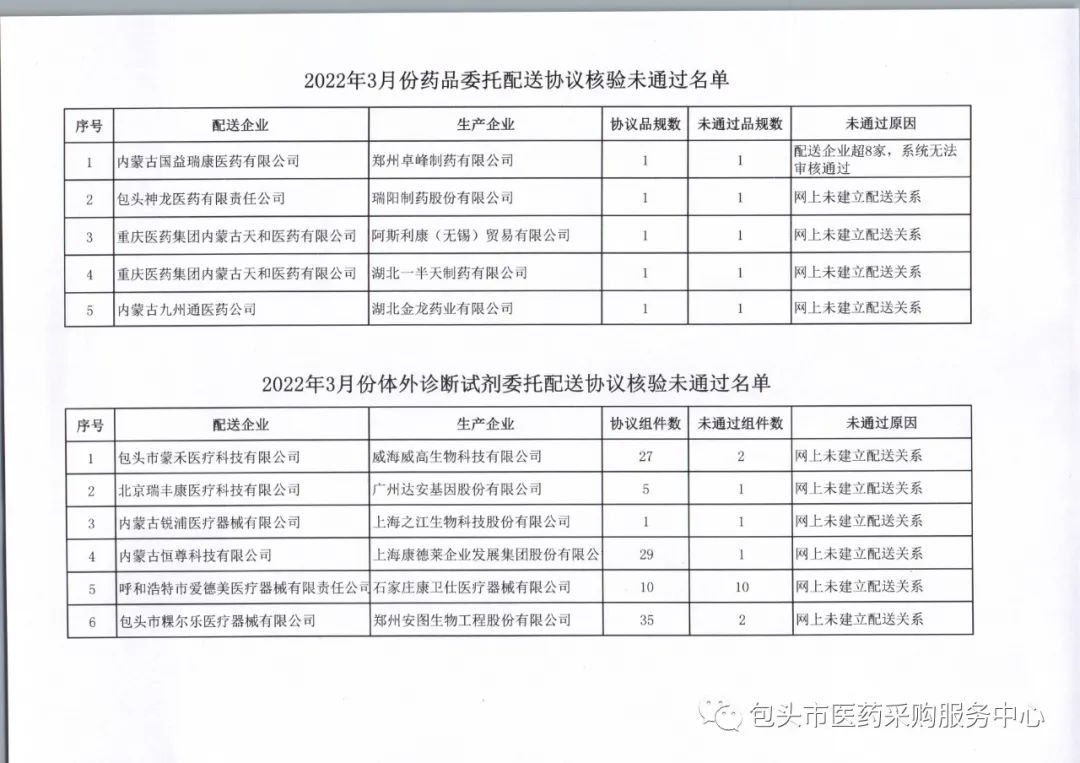 【包头】内蒙古自治区包头市2022年3月份委托配送协议核验未通过名单(20220311)