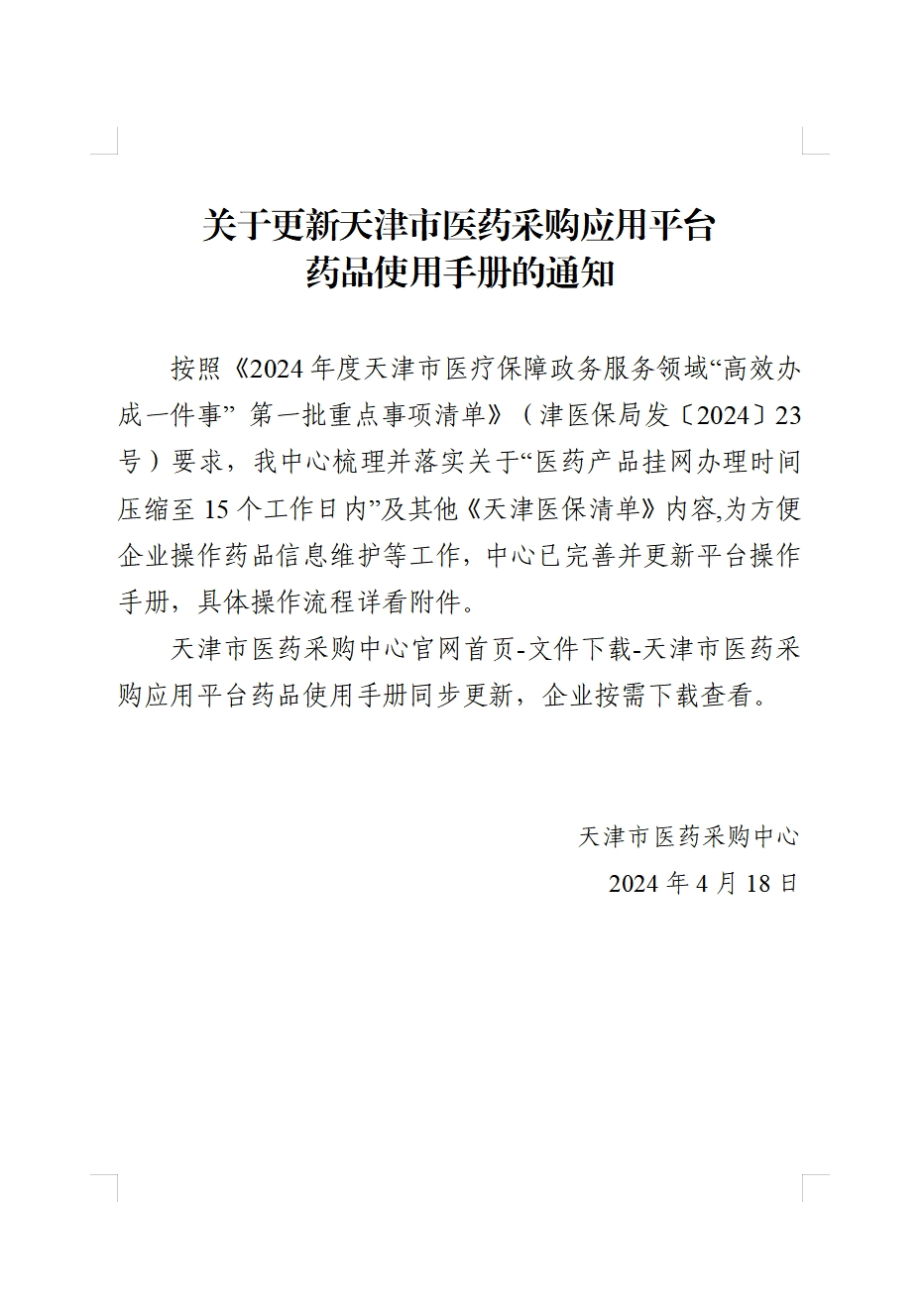 【天津】关于更新天津市医药采购应用平台药品使用手册的通知