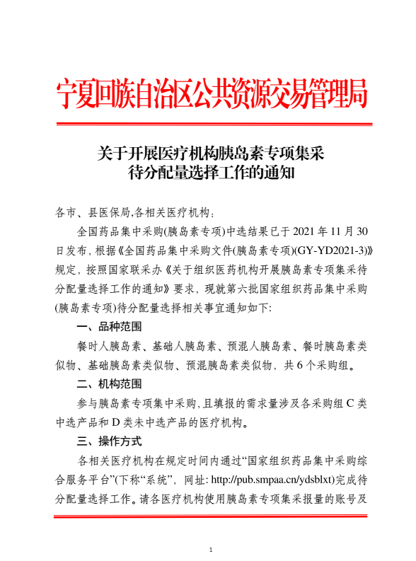 【宁夏】宁夏回族自治区关于开展医疗机构胰岛素专项集采待分配量选择工作的通知
