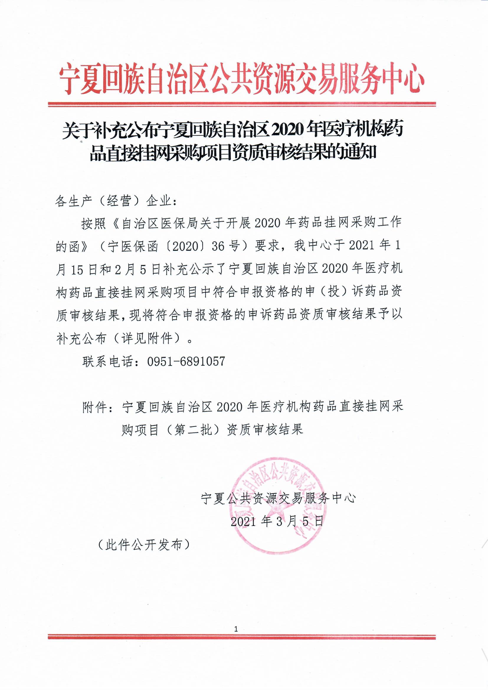 【宁夏】2021年宁夏自治区关于补充公布宁夏回族自治区2020年医疗机构药品直接挂网采购项目资质审核结果的通知