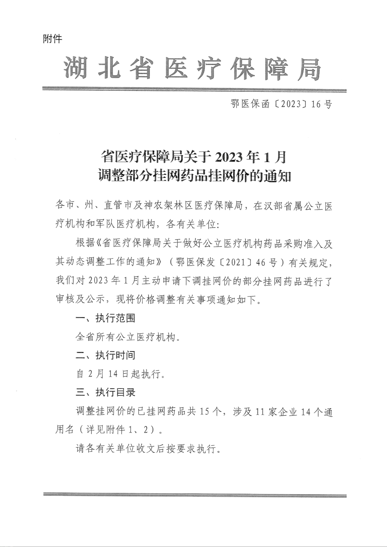 现将《省医疗保障局关于2023年1月调整部分挂网药品挂网价的通知》(鄂医保函[2023]16号)转发给你们,请各有关单位收文后按要求执行。