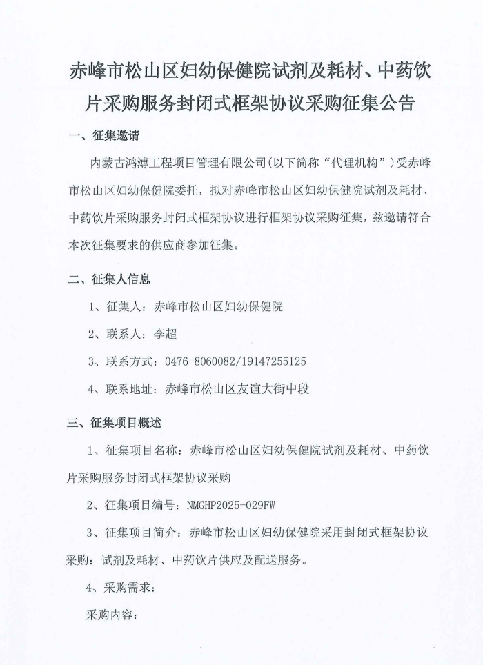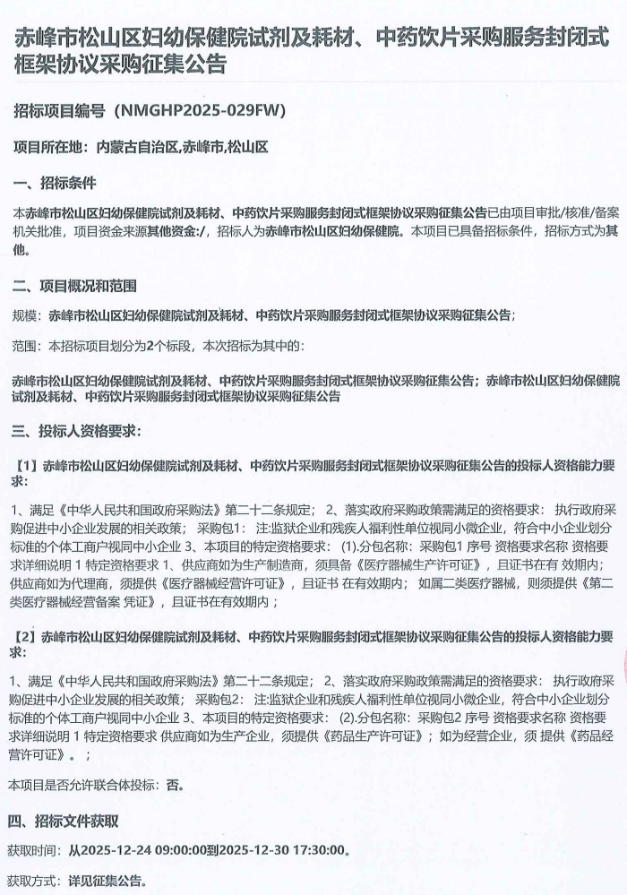【赤峰市松山区妇幼保健院】内蒙古自治区赤峰市松山区妇幼保健院试剂及耗材、中药饮片采购服务封闭式框架协议采购征集公告
