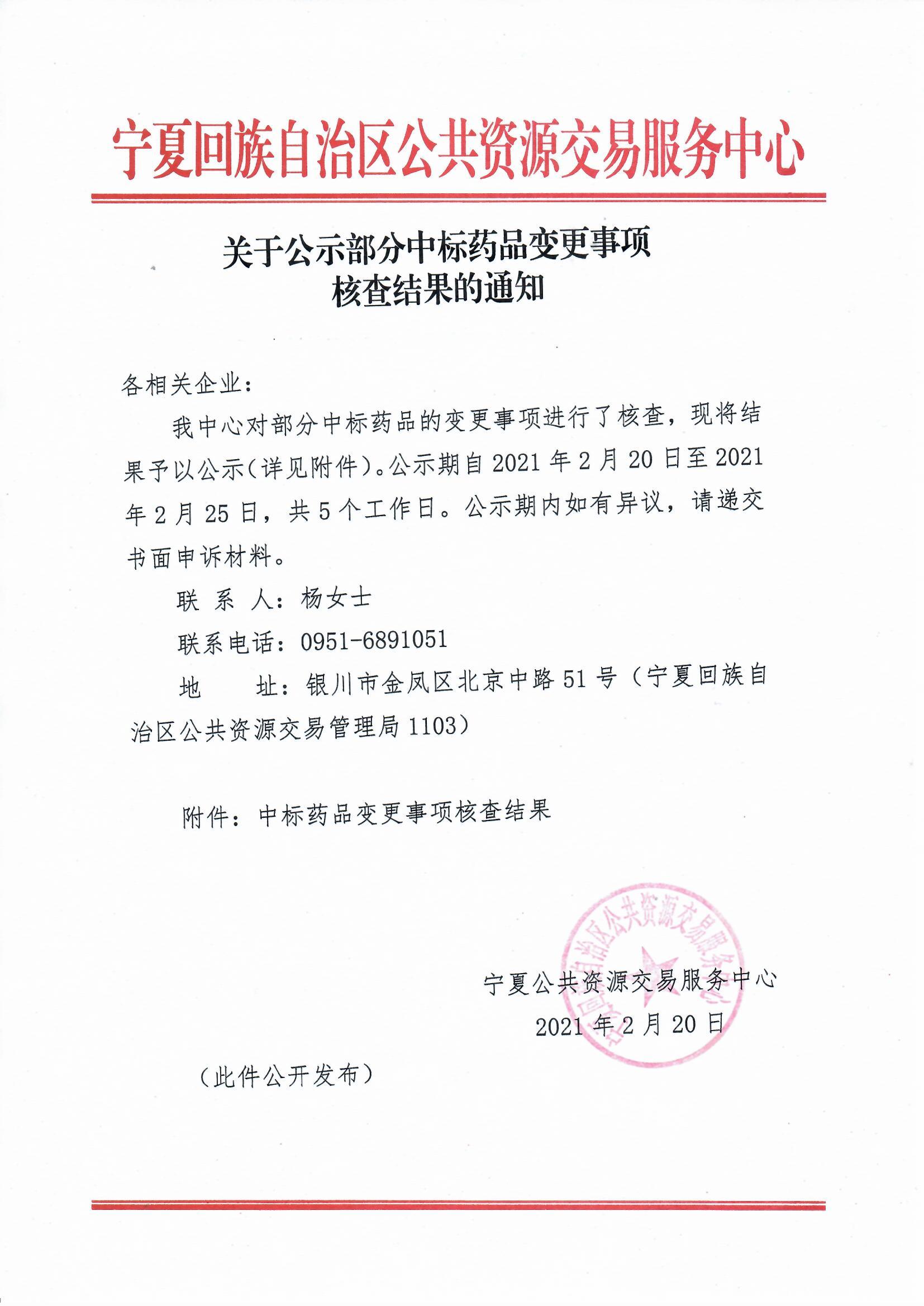【宁夏】2021年宁夏自治区关于公示部分中标药品变更事项核查结果的通知