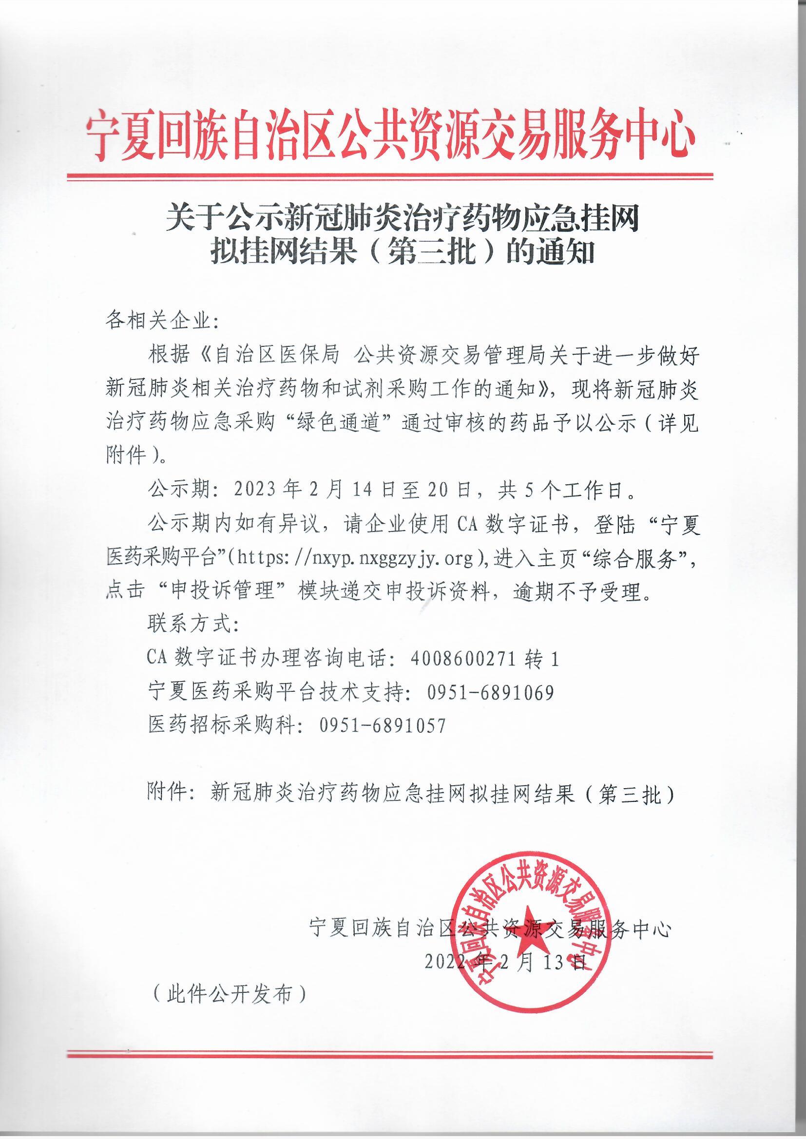附件:新冠肺炎治疗药物应急挂网拟挂网结果(第三批)