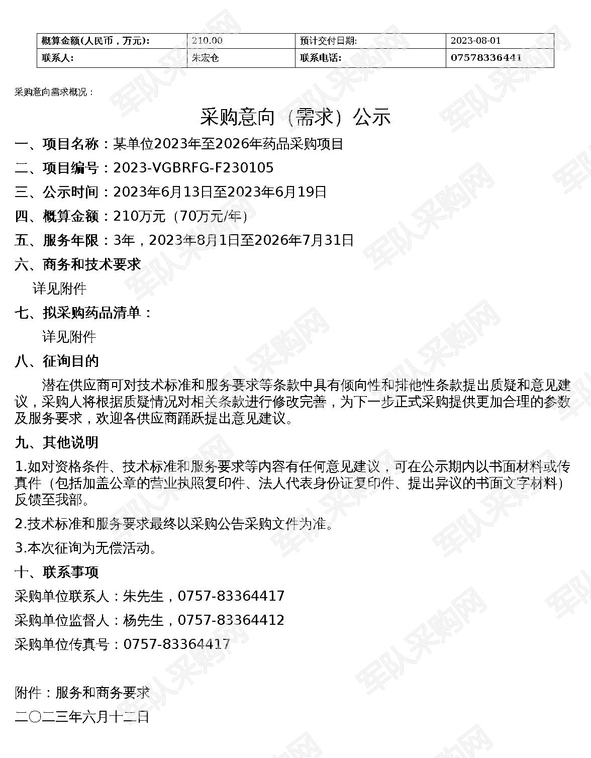 【军队采购】军队采购网某单位2023年至2026年药品采购项目采购意向(需求)公示2023-VGBRFG-F230105
