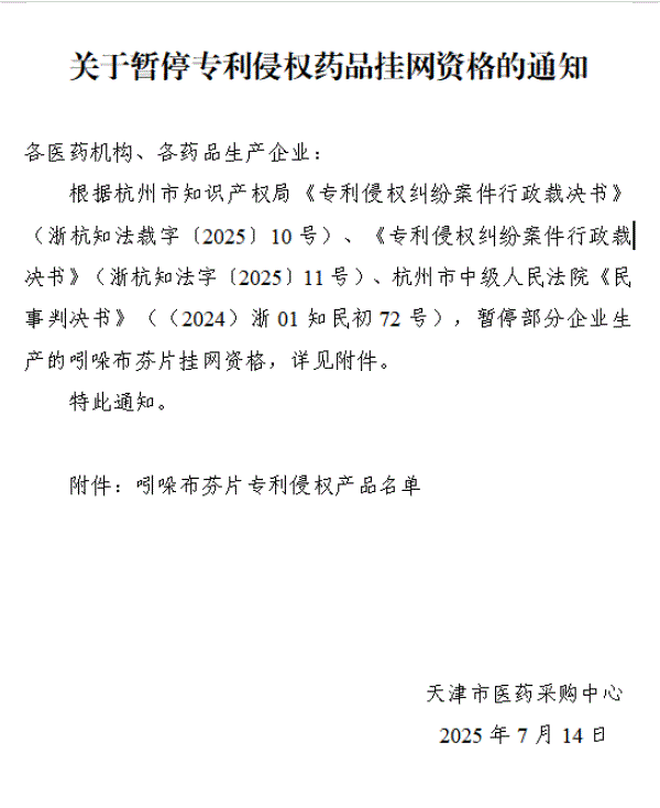 【天津】天津市关于暂停专利侵权药品挂网资格的通知
