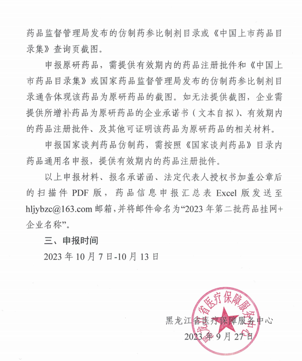 【黑龙江】关于开展2023年第二批通过(含视同通过)质量和疗效一致性评价的仿制药原研药参比制剂国家谈判药品仿制药挂网申报工作的通知