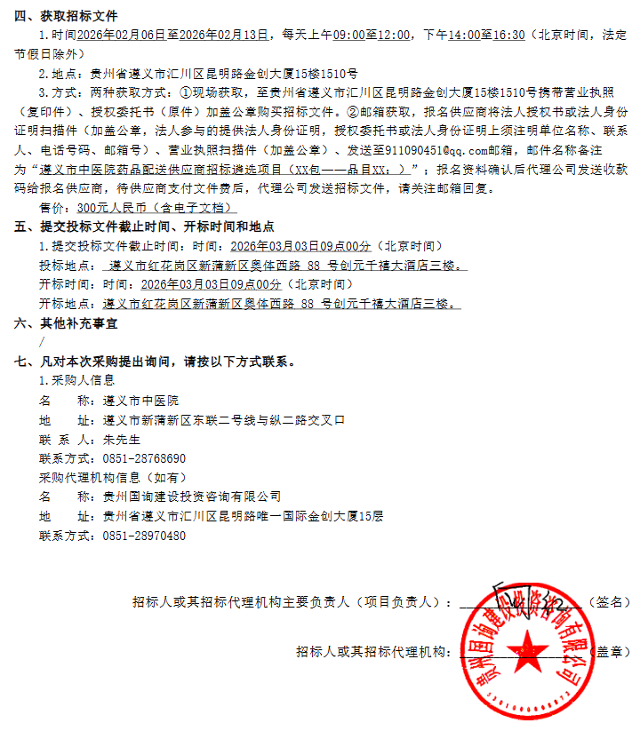 【遵义市中医院】贵州省遵义市中医院药品配送供应商招标遴选项目招标公告