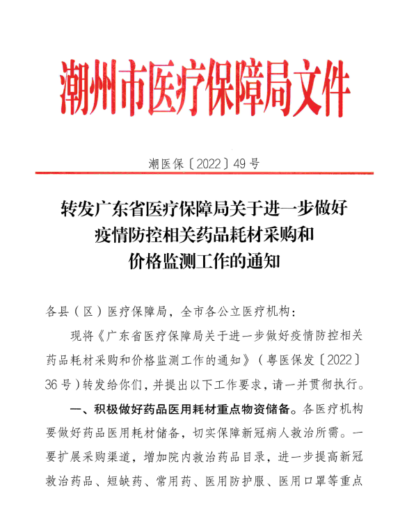 【潮州】广东省潮州市转发广东省医疗保障局关于进一步做好疫情防控相关药品耗材采购和价格监测工作的通知