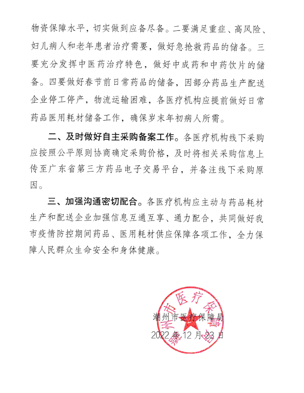 各县(区)医疗保障局,全市各公立医疗机构: 现将《广东省医疗保障局关于进一步做好疫情防控相关药品耗材采购和价格监测工作的通知》(粤医保发〔2022〕36号)转发给你们,并提出以下工作要求,请一并贯彻执行。 一、积极做好药品医用耗材重点物资储备。各医疗机构要做好药品医用耗材储备,切实保障新冠病人救治所需。一要扩展采购渠道,增加院内救治药品目录,进一步提高新冠救治药品、短缺药、常用药、医用防护服、医用口罩等重点物资保障水平,切实做到应备尽备。二要满足重症、高风险、妇儿病人和老年患者治疗需要,做好急抢救药品的储备。三要充分发挥中医药治疗特色,做好中成药和中药饮片的储备。四要做好春节前日常药品的储备,因部分药品生产配送企业停工停产,物流运输困难,各医疗机构应提前做好日常药品医用耗材储备工作,确保岁末年初病人所需。 二、及时做好自主采购备案工作。各医疗机构线下采购应按照公平原则协商确定采购价格,及时将相关采购信息上传至广东省第三方药品电子交易平台,并备注线下采购原因。 三、加强沟通密切配合。各医疗机构应主动与药品耗材生产和配送企业加强信息互通互享、通力配合,共同做好我市疫情防控期间药品、医用耗材供应保障各项工作、全力保障人民群众生命安全和身体健康。