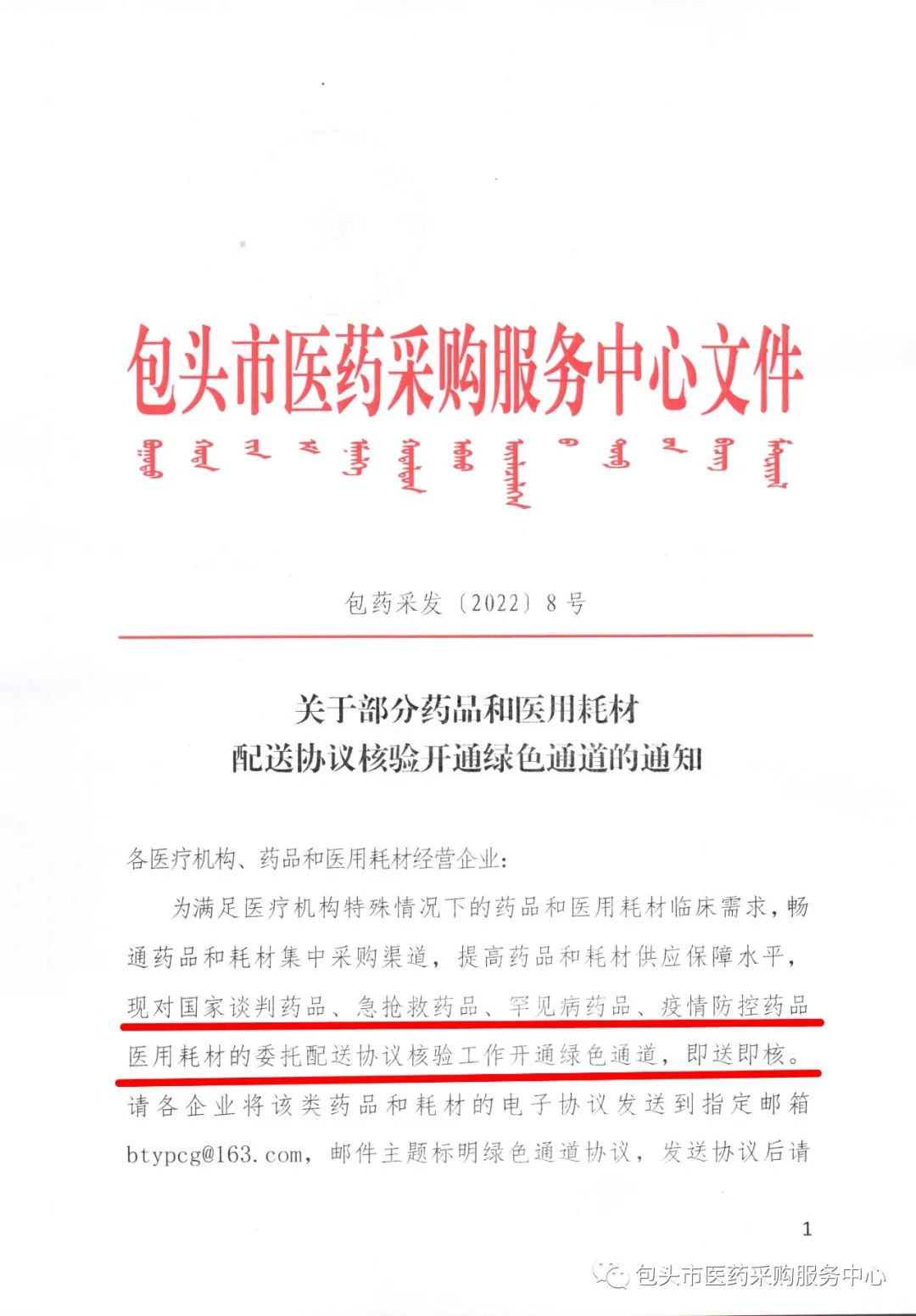 【包头】内蒙古自治区包头市关于部分药品和医用耗材配送协议核验开通绿色通道的通知