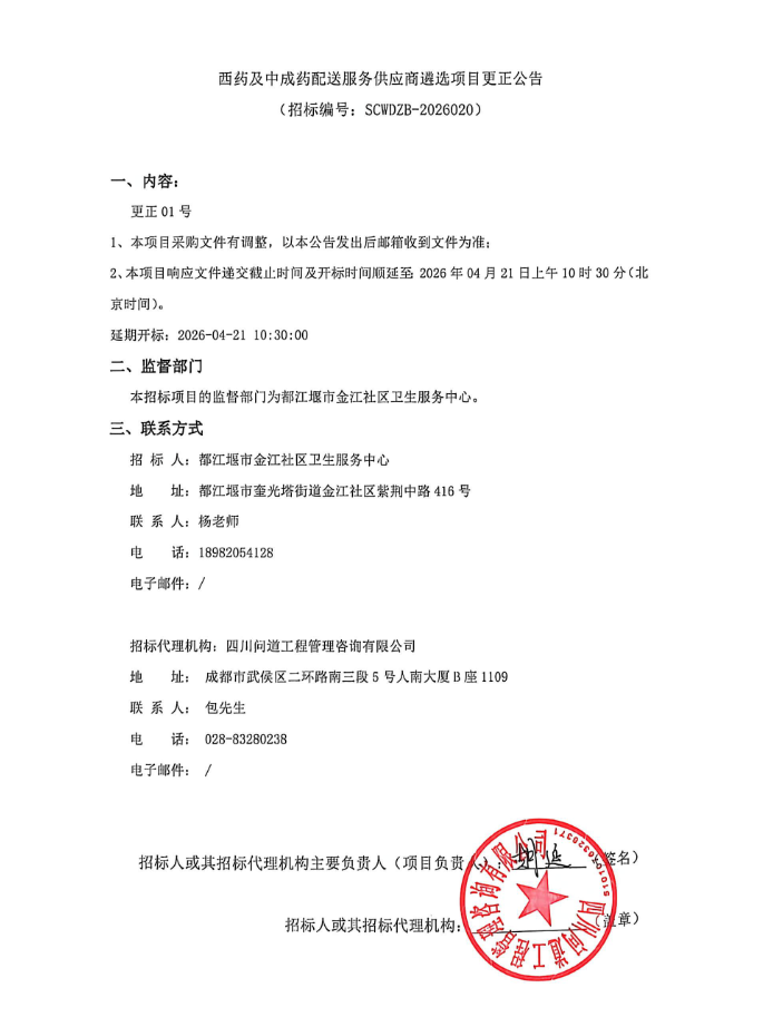 【成都市都江堰市金江社区卫生服务中心】四川省都江堰市金江社区卫生服务中心西药及中成药配送服务供应商遴选项目更正公告