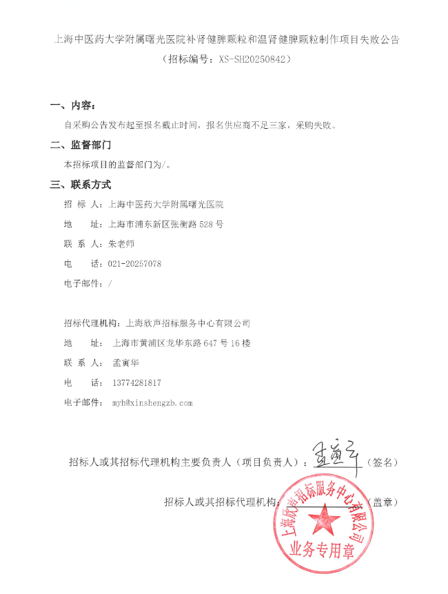【上海中医药大学附属曙光医院】上海中医药大学附属曙光医院补肾健脾颗粒和温肾健脾颗粒制作项目失败公告