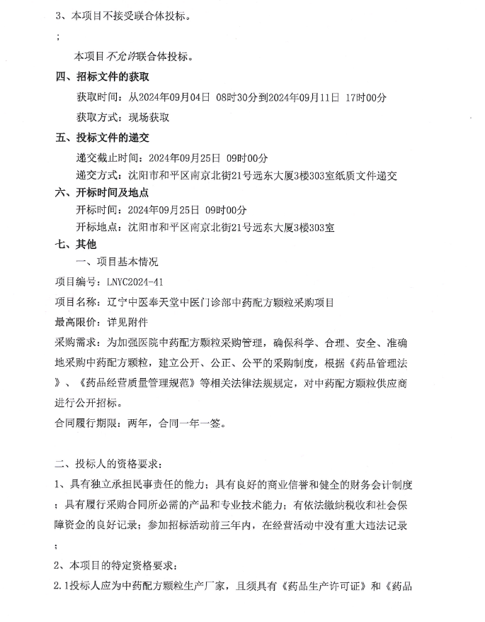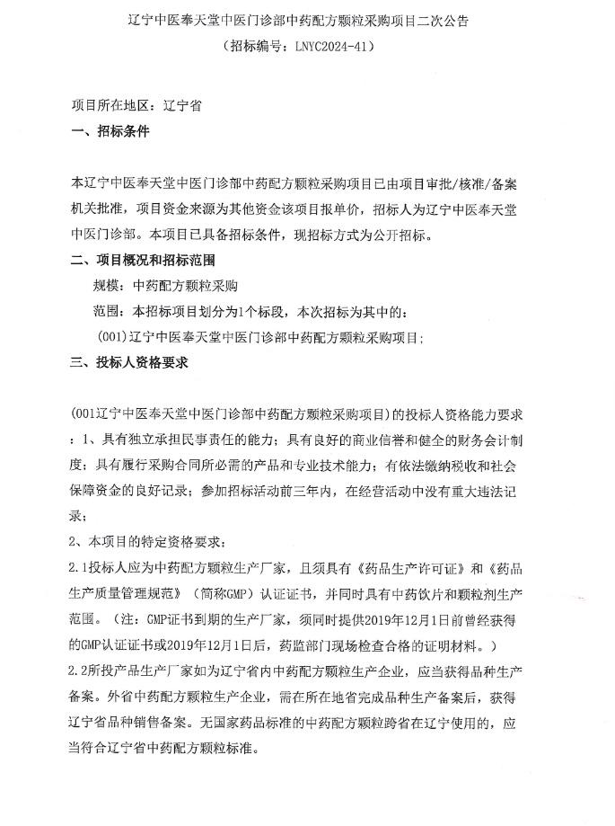 【辽宁中医奉天堂中医门诊部】辽宁中医奉天堂中医门诊部中药配方颗粒采购项目二次公告