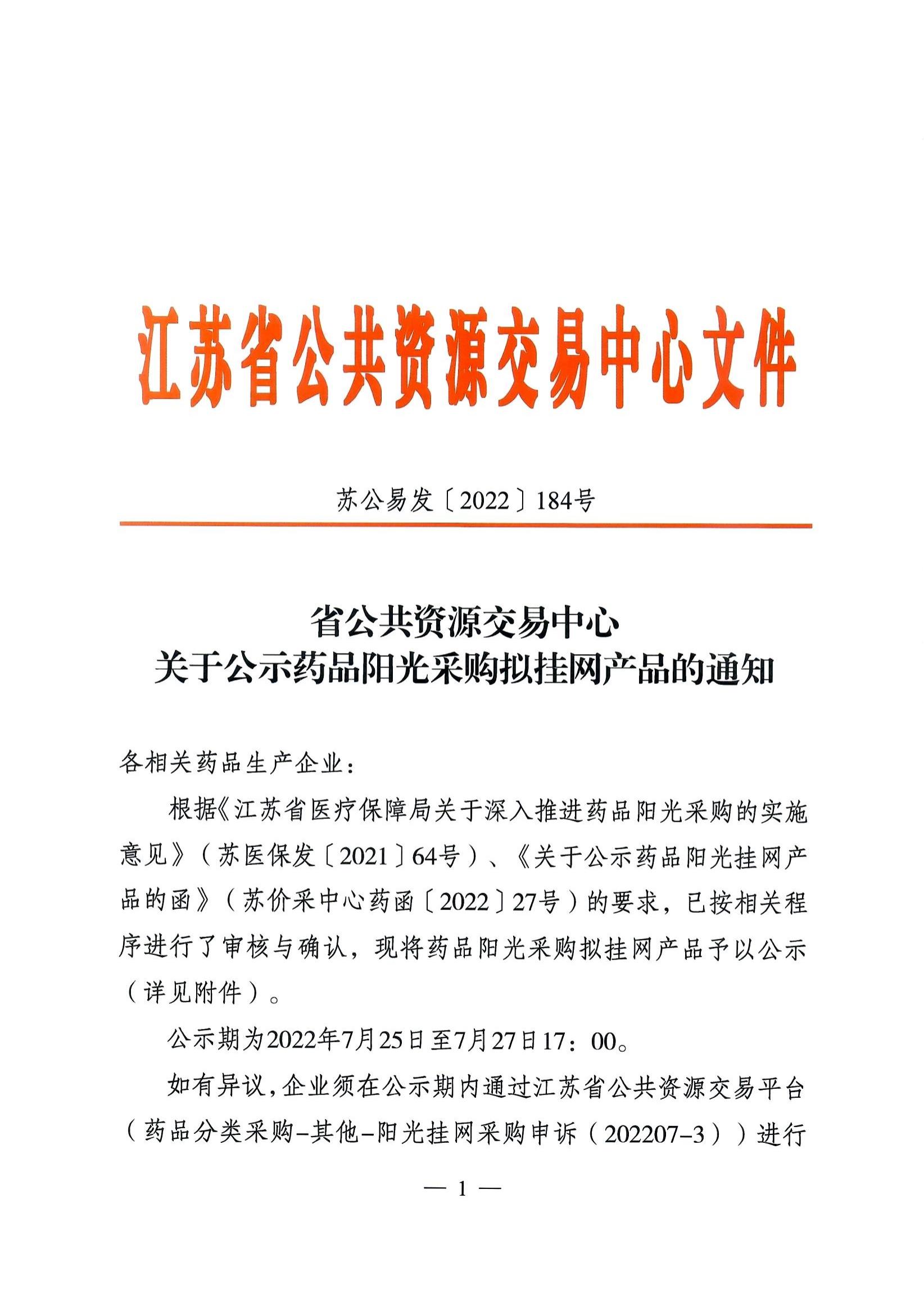 【江苏】省公共资源交易中心关于公示药品阳光采购拟挂网产品的通知