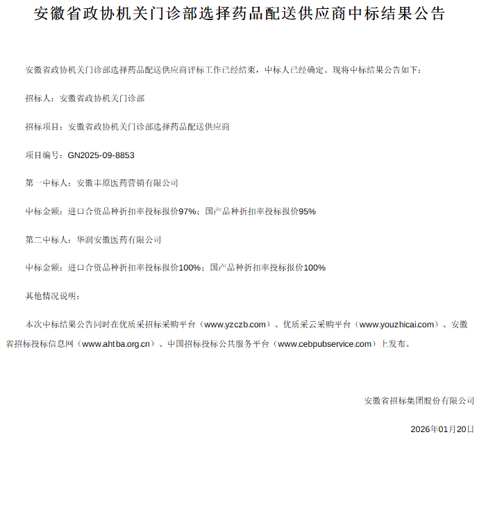【安徽省政协机关门诊部】安徽省政协机关门诊部选择药品配送供应商中标结果公告