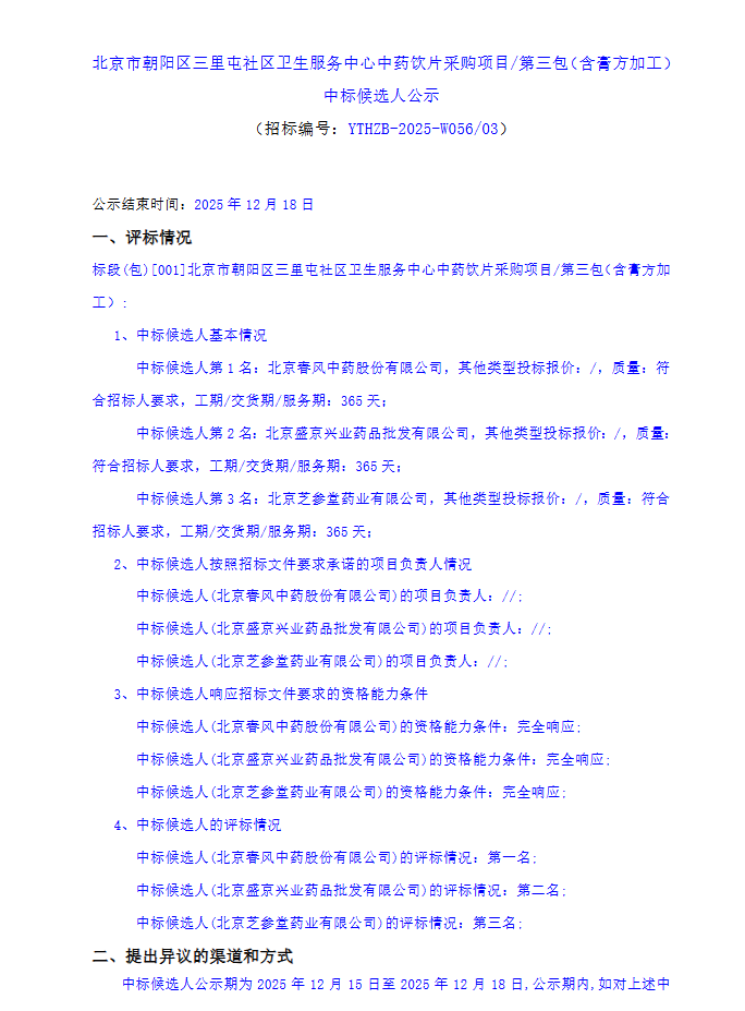 【北京市朝阳区三里屯社区卫生服务中心】北京市朝阳区三里屯社区卫生服务中心中药饮片采购项目/第三包(含膏方加工)中标候选人公示