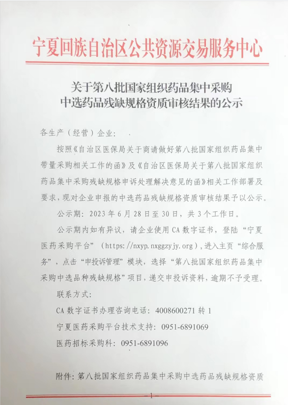 公示期内如有异议,请企业使用CA数字证书,登陆“宁夏医药采购平台”(https://nxyp.nxggzyjy.org),进入主页"综合服务”,点击“申投诉管理”模块,选择"第八批国家组织药品集中采购中选品种残缺规格”项目,递交申投诉资料,逾期不予受理。