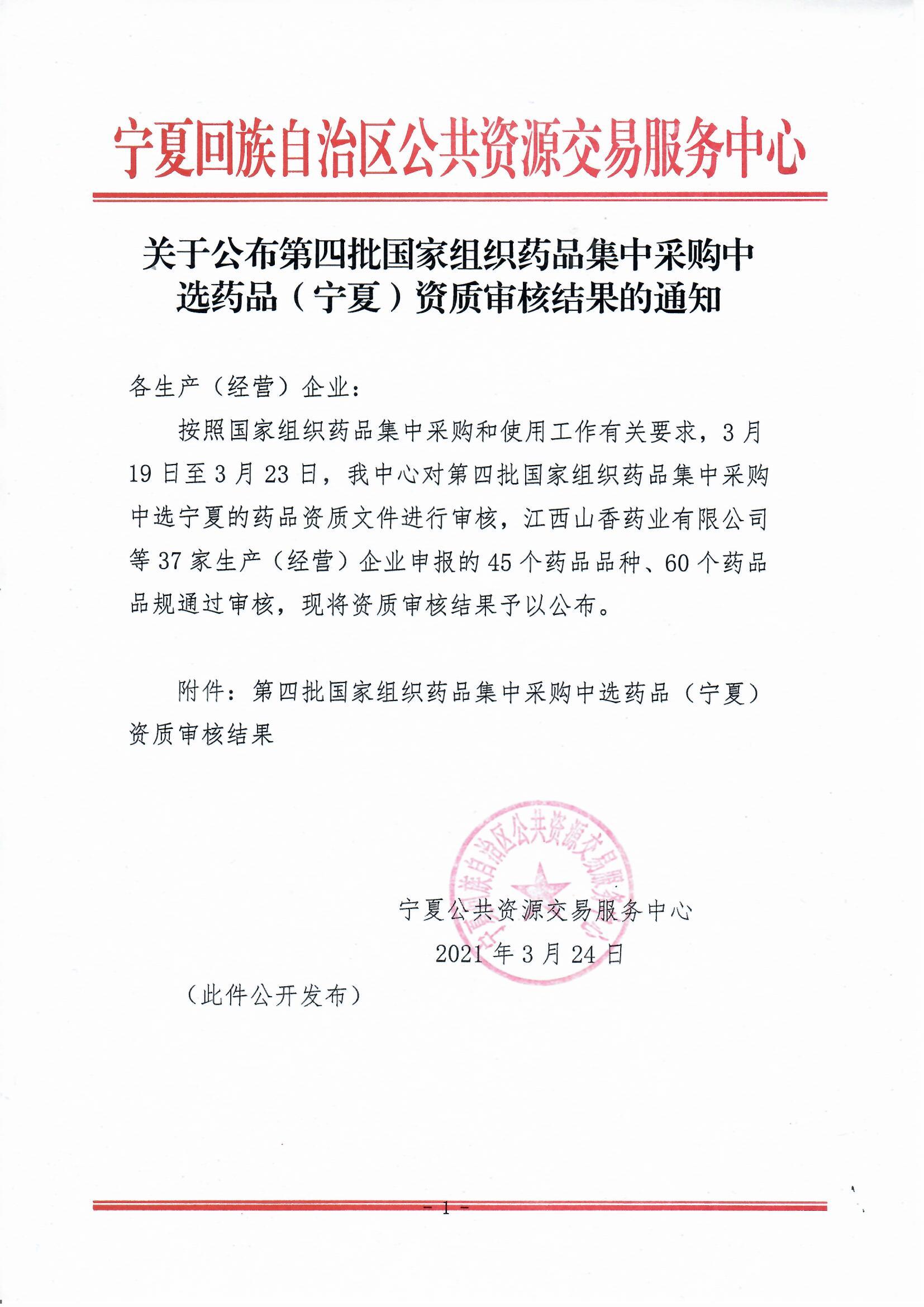 【宁夏】2021年宁夏自治区关于公布第四批国家组织药品集中采购中选药品(宁夏)资质审核结果的通知