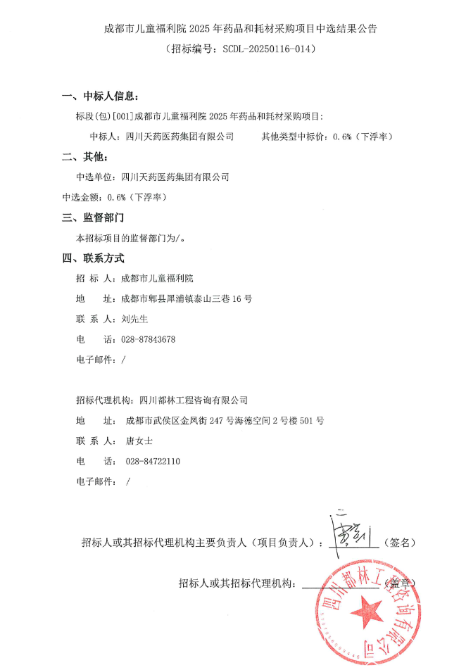 【成都市儿童福利院】四川省成都市儿童福利院2025年药品和耗材采购项目中选结果公告