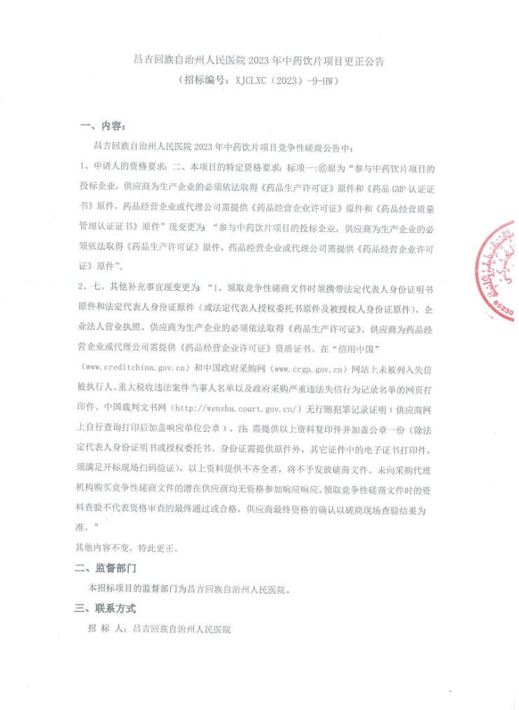 【昌吉回族自治州人民医院】新疆维吾尔自治区昌吉回族自治州人民医院2023年中药饮片项目更正公告