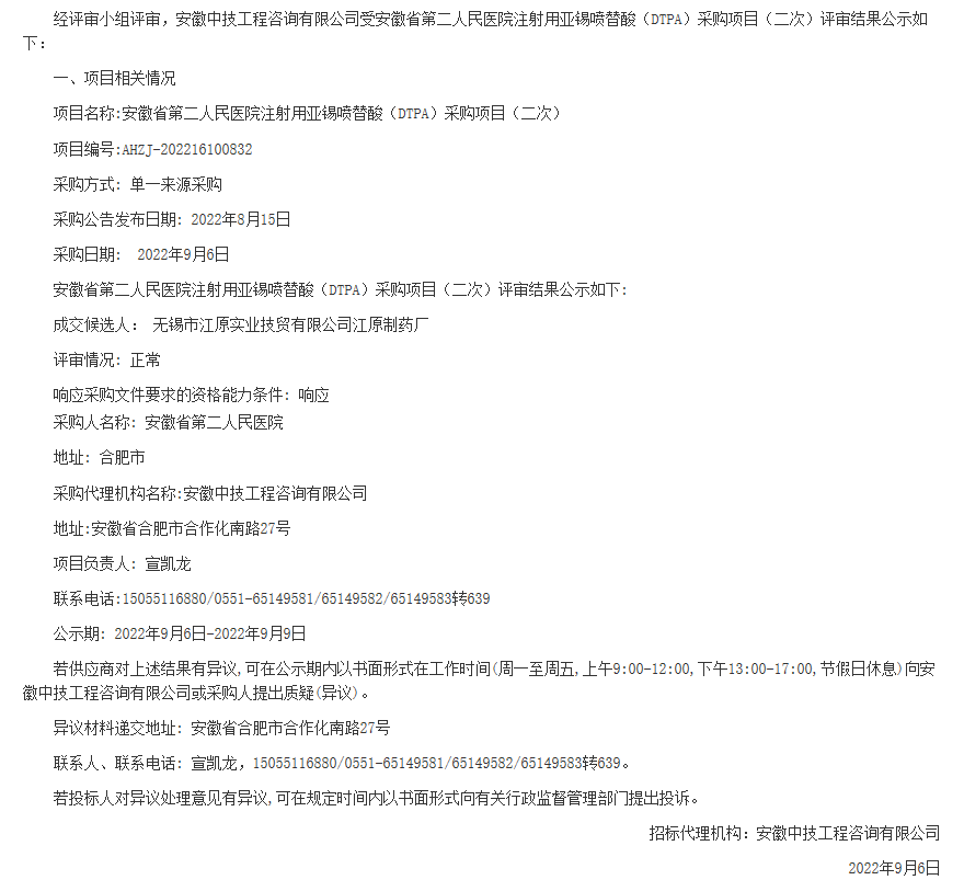 【安徽省第二人民医院】注射用亚锡喷替酸(DTPA)采购项目(二次)评审结果公示