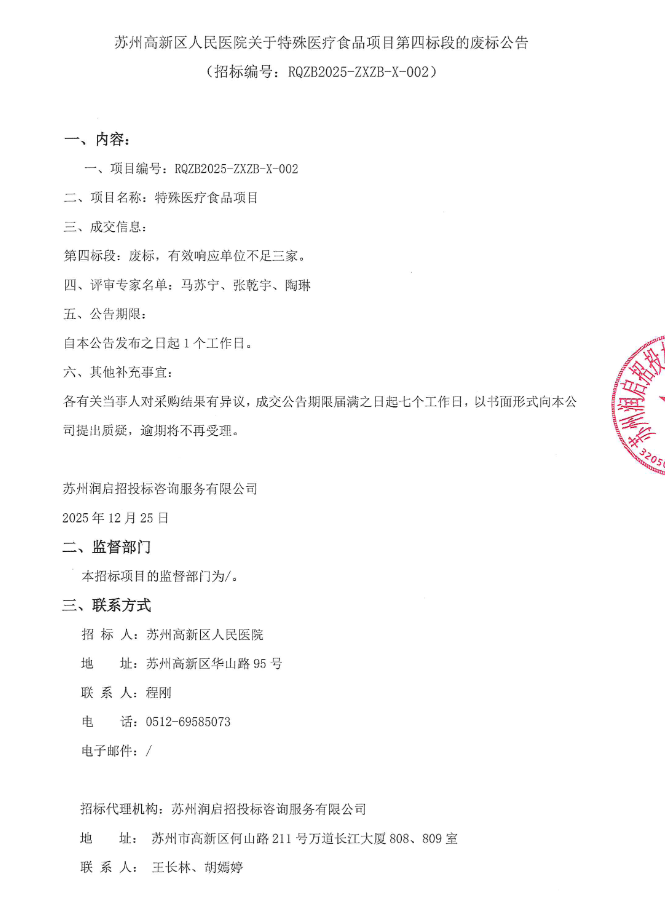 【苏州高新区人民医院】江苏省苏州高新区人民医院关于特殊医疗食品项目第四标段的废标公告