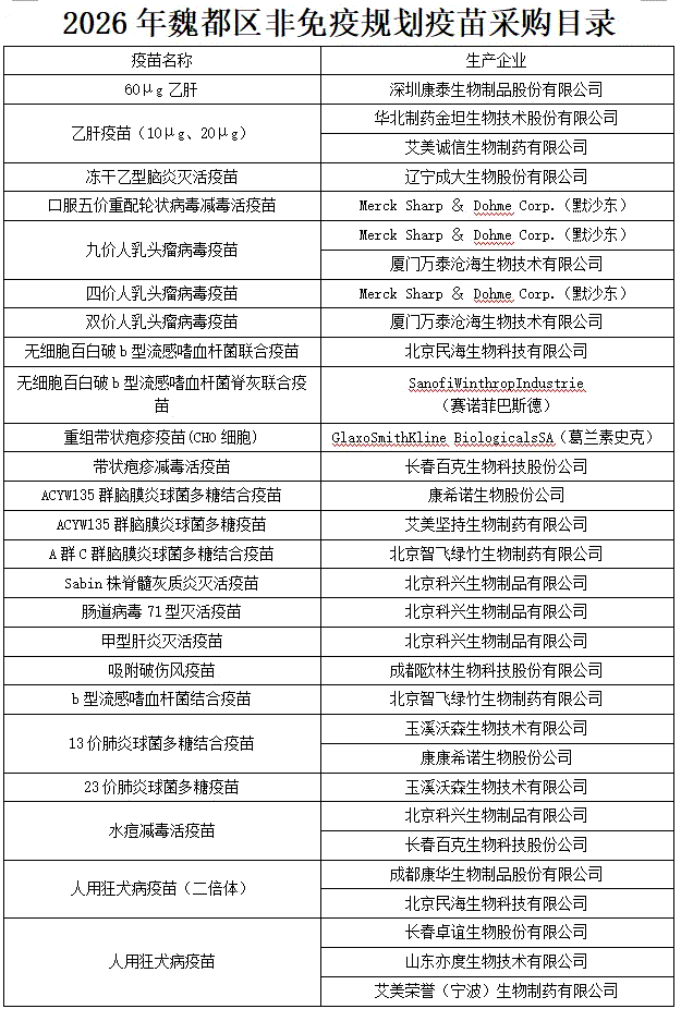 为规范我区非免疫规划疫苗的采购与管理,保障疫苗质量和接种安全,满足公众疫苗接种需求,根据《中华人民共和国疫苗管理法》、《魏都区非免疫规划疫苗遴选实施方案》及相关文件精神,我中心于2025年12月22日下午召开了魏都区非免疫规划疫苗遴选会。本次遴选会议遵循公开、公平、公正的原则,遴选出了2026年魏都区非免疫规划疫苗采购目录(见附件),现予以公示。