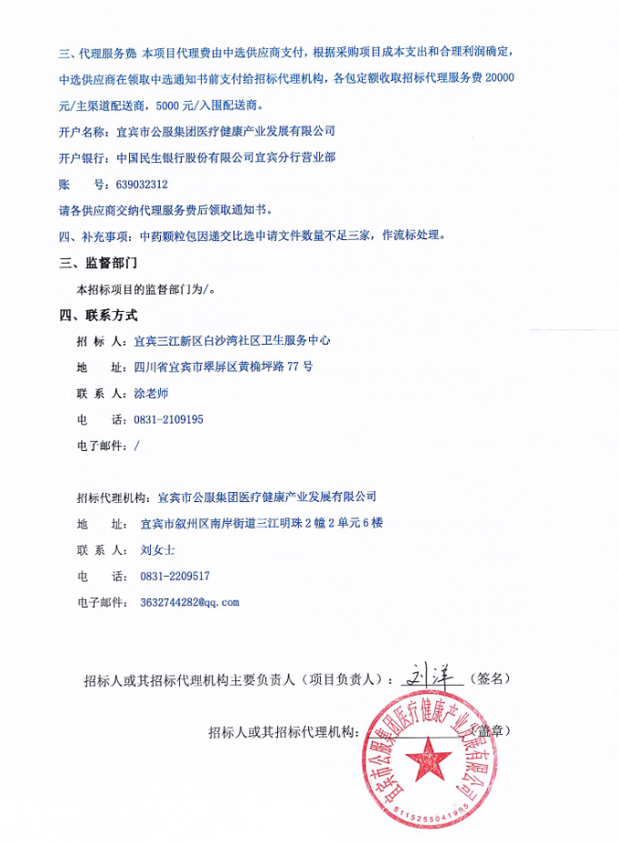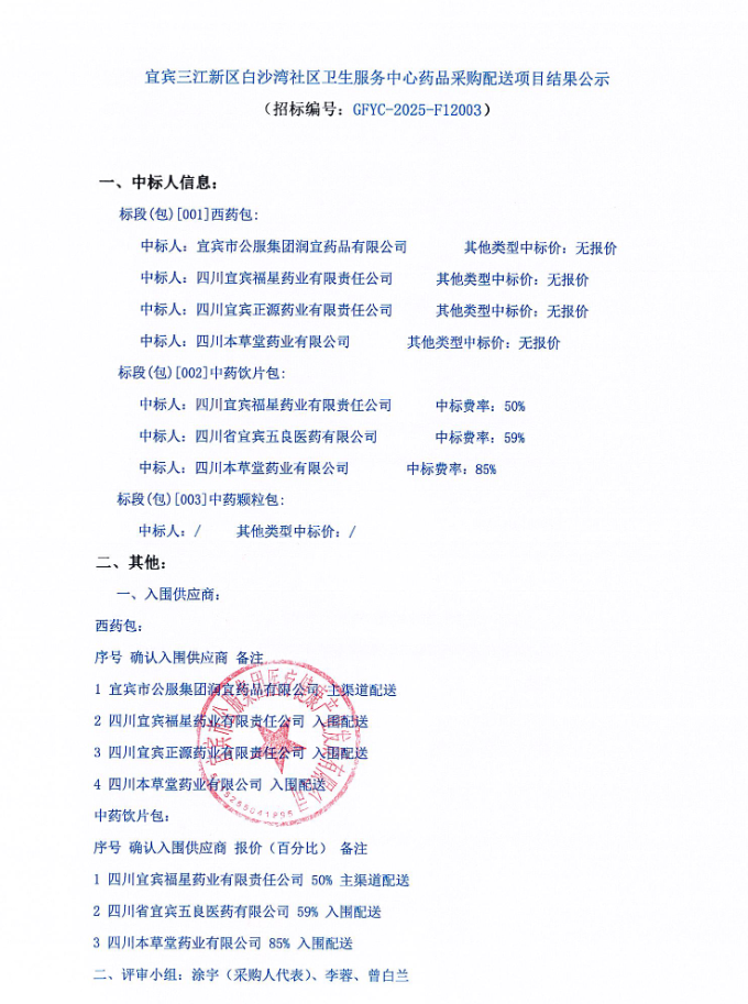 【宜宾三江新区白沙湾社区卫生服务中心】四川省宜宾三江新区白沙湾社区卫生服务中心药品采购配送项目结果公示