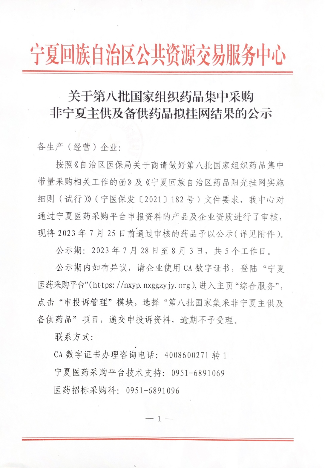 公示期内如有异议,请企业使用CA数字证书,登陆“宁夏医药采购平台”(https://nxyp.nxggzyjy.org),进入主页“综合服务”,点击“申投诉管理”模块,选择“第八批国家集采非宁夏主供及备供药品”项目,递交申投诉资料,逾期不予受理。