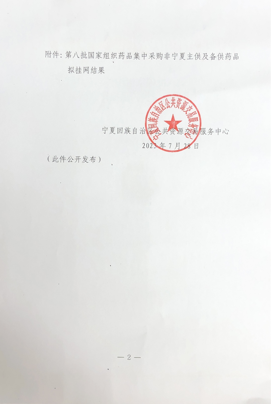 按照《自治区医保局关于商请做好第八批国家组织药品集中带量采购相关工作的函》及《宁夏回族自治区药品阳光挂网实施细则(试行)》(宁医保发〔2021〕182号)文件要求,我中心对通过宁夏医药采购平台申报资料的产品及企业资质进行了审核,现将2023年7月25日前通过审核的药品予以公示(详见附件)。