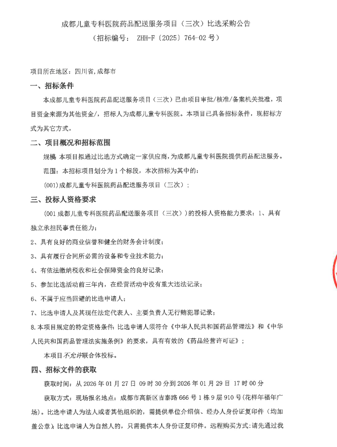 【成都儿童专科医院】四川省成都儿童专科医院药品配送服务项目(三次)比选采购公告