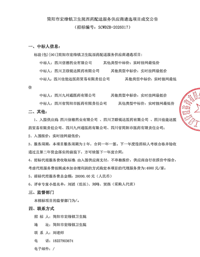 【成都市简阳市宏缘镇卫生院】四川省成都市简阳市宏缘镇卫生院西药配送服务供应商遴选项目成交公告
