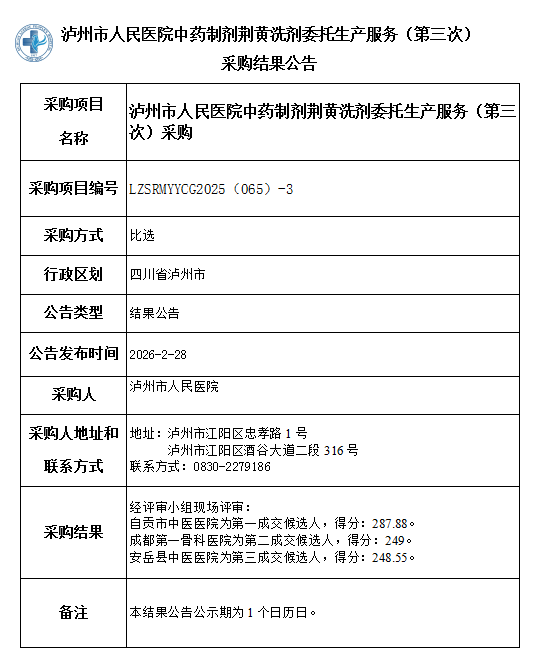 【泸州市人民医院】四川省泸州市人民医院中药制剂荆黄洗剂委托生产服务(第三次)采购结果公告