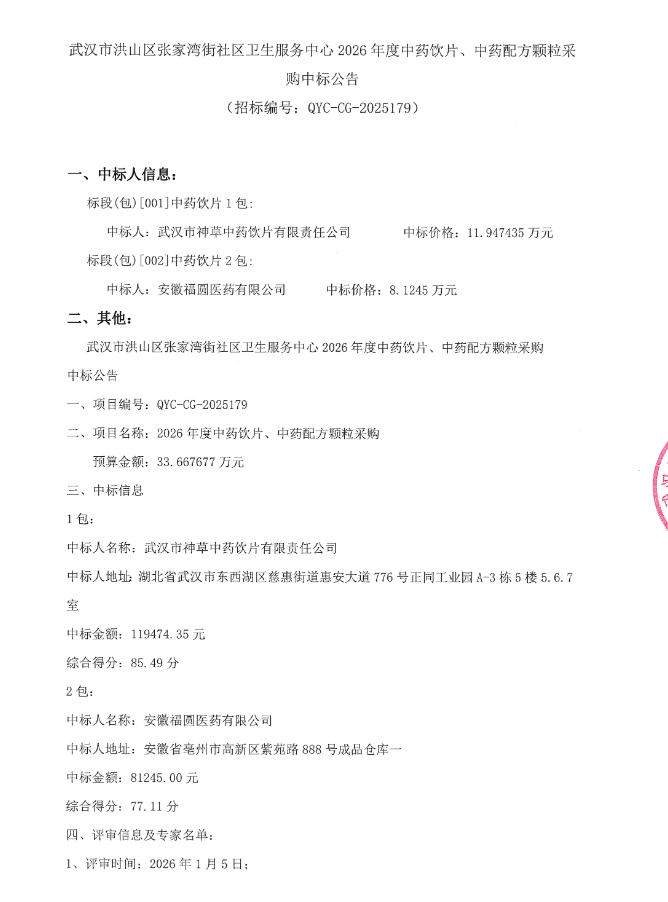 【武汉市洪山区张家湾街社区卫生服务中心】湖北省武汉市洪山区张家湾街社区卫生服务中心2026年度中药饮片、中药配方颗粒采购中标公告